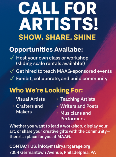 We’re looking for artists who would like to host their own class or workshop, teach at MAAG-sponsored events, exhibit, collaborate, and build community.